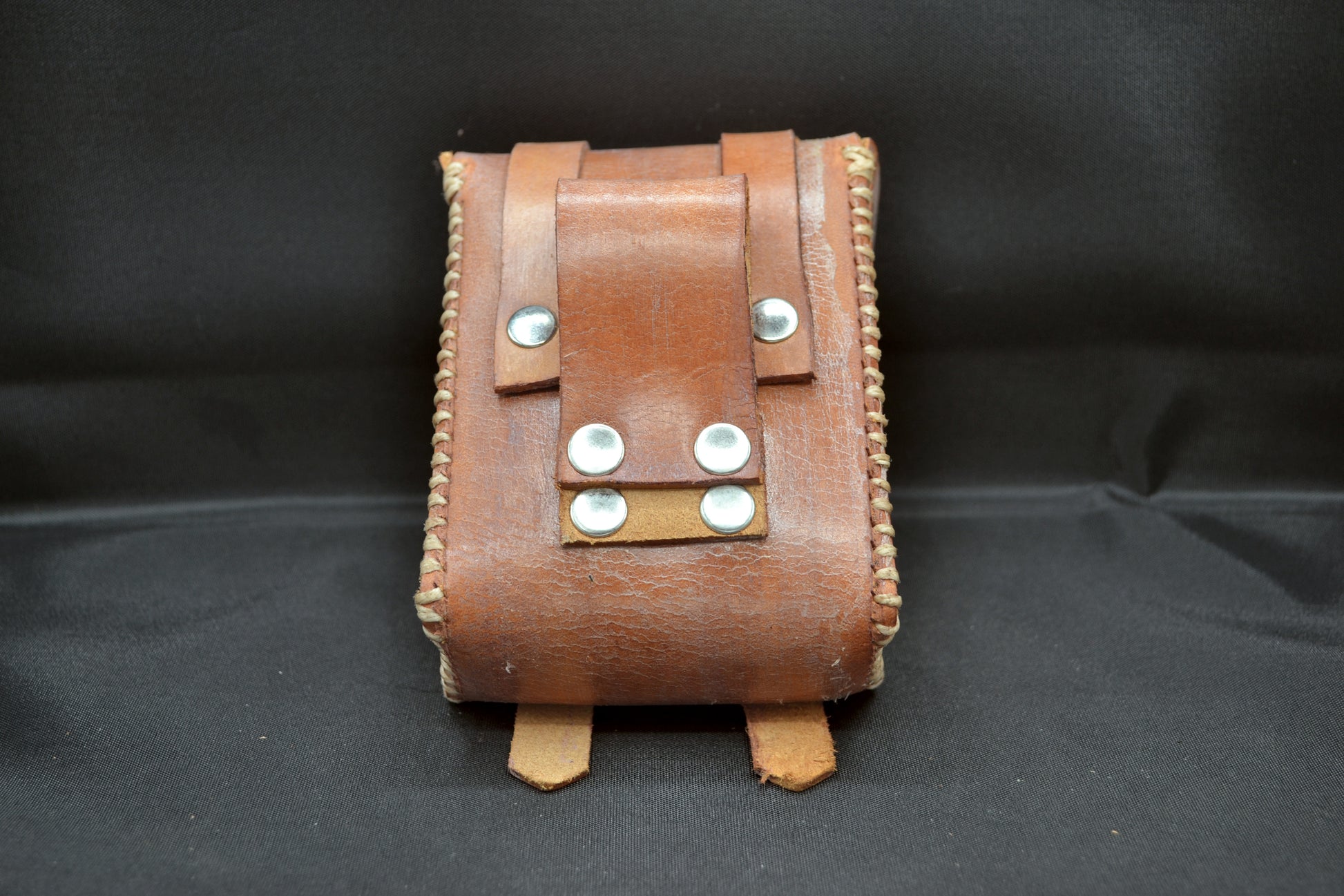 Handmade and sewn using a few simple parts. The pouch uses thin but durable 5 to 6 oz veg tanned leather shoulder that is flexible. It is hand finished with antique stain color that gives the material great contrast. Fits 1.25" belts through an affixed loop. Line 20 snaps secure the straps to the pouch front. Rivets are fine quality and many for decoration. For the labor of pouch making this item is priced below the norm. Already with a broken in look it will hold its shape and appearance for years to come.