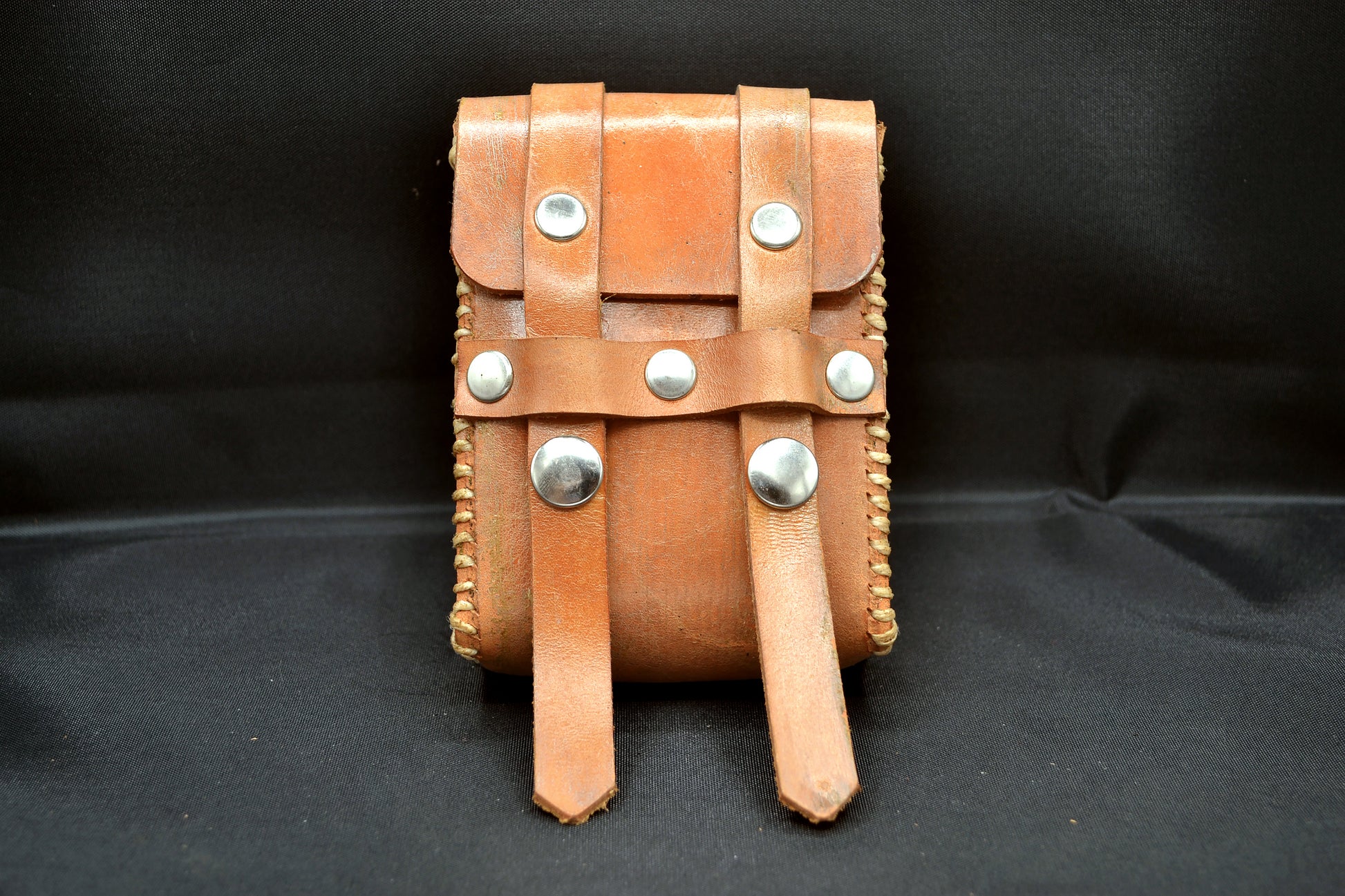 Handmade and sewn using a few simple parts. The pouch uses thin but durable 5 to 6 oz veg tanned leather shoulder that is flexible. It is hand finished with antique stain color that gives the material great contrast. Fits 1.25" belts through an affixed loop. Line 20 snaps secure the straps to the pouch front. Rivets are fine quality and many for decoration. For the labor of pouch making this item is priced below the norm. Already with a broken in look it will hold its shape and appearance for years to come.