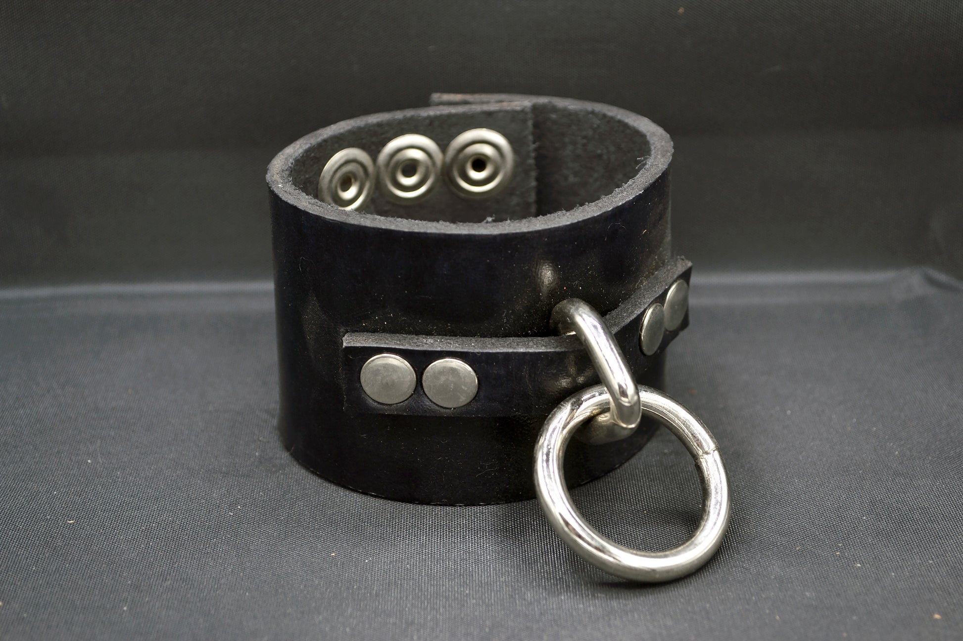 The bracelet is a delicate process to create and it takes attention to detail. These bracelets were made of the only available materials and tools at the time. The weight of the leather is 9 to 10 oz of a thick shoulder that was available in my confined workspace. Cumbersome as it may be it is as durable as the belts and with hard action snaps there is potential for heavy durability. Studs are set properly so they will not chafe the wrist. Bondage rings and studs are a classic look. The heavy bracelet is a landmark of the beginning of this business and made from necessity. It represents that mentality.