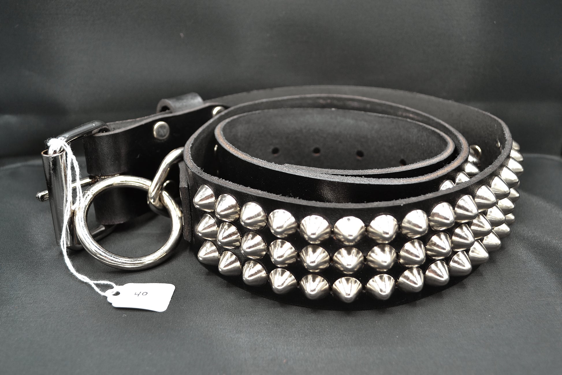 his type of shining black leather is a best combination explored by enthusiasts and respected by serious crowds. It features both the bondage ring and studs which represent a duality of power in the individual.