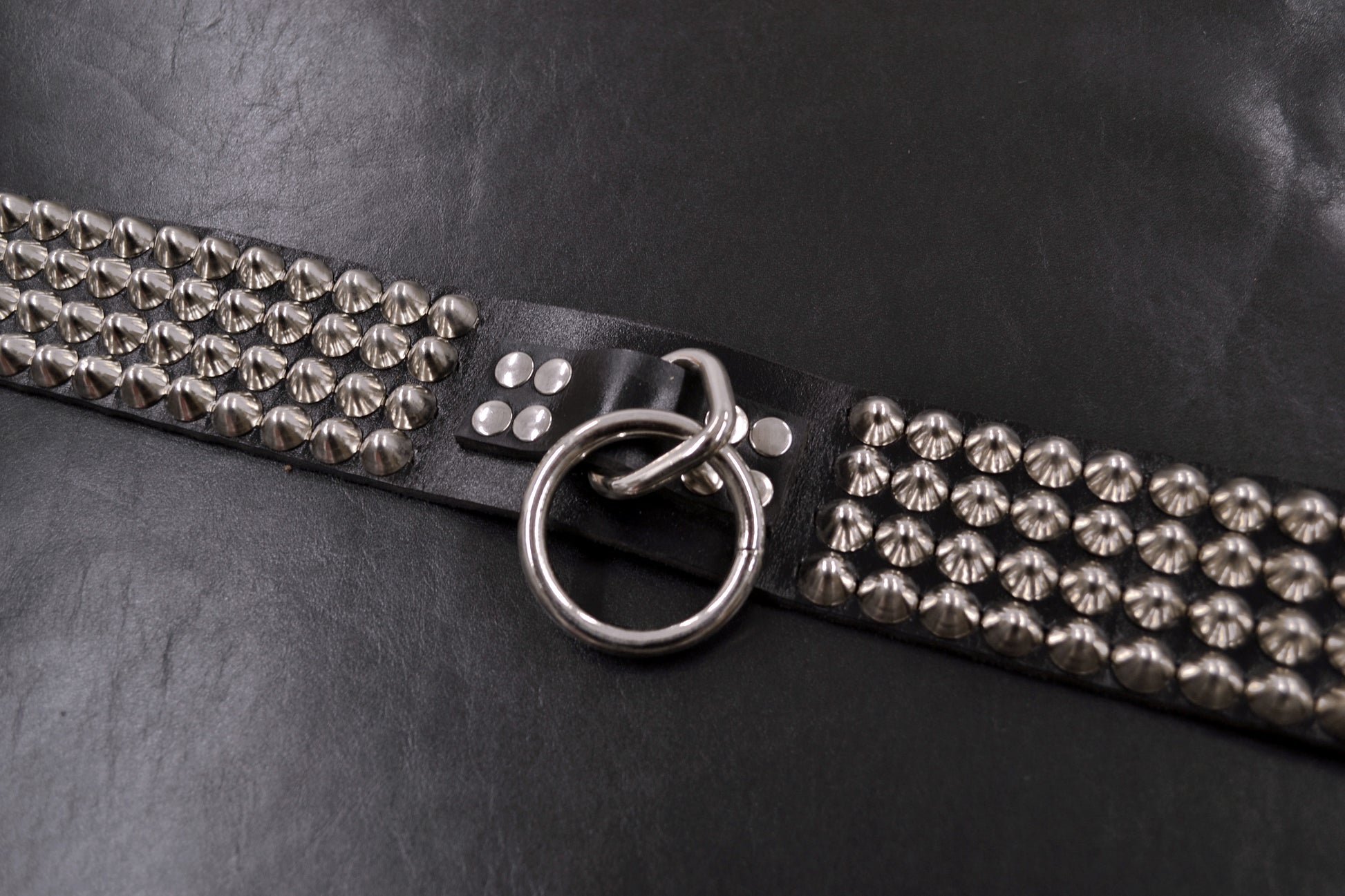 This type of shining black leather is a best combination explored by enthusiasts and respected by serious crowds. It features both the bondage ring and studs which represent a duality of power in the individual.