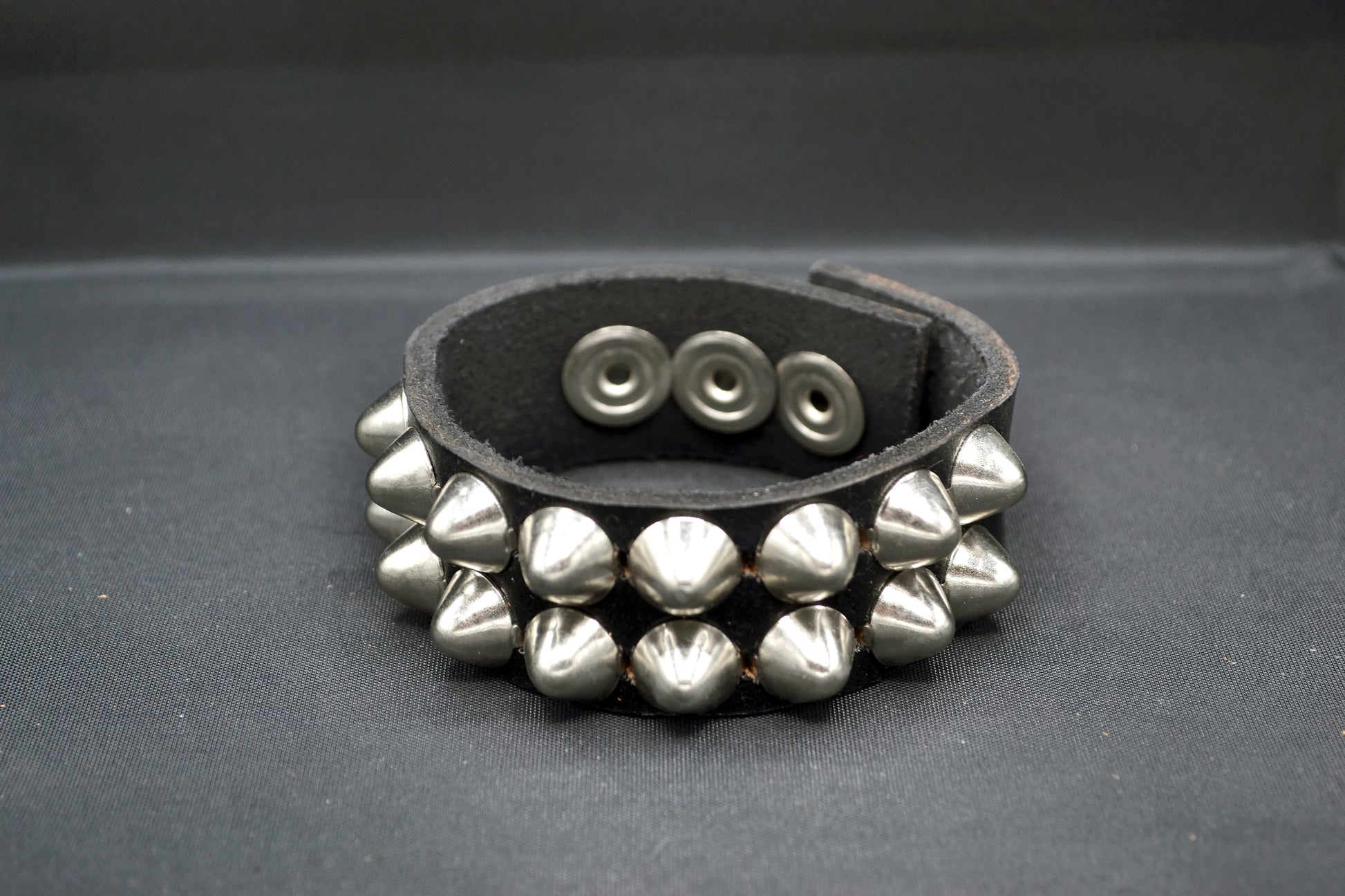 The bracelet is a delicate process to create and it takes attention to detail. These bracelets were made of the only available materials and tools at the time. The weight of the leather is 9 to 10 oz of a thick shoulder that was available in my confined workspace. Cumbersome as it may be it is as durable as the belts and with hard action snaps there is potential for heavy durability. Studs are set properly so they will not chafe the wrist. Bondage rings and studs are a classic look. The heavy bracelet is a landmark of the beginning of this business and made from necessity. It represents that mentality.