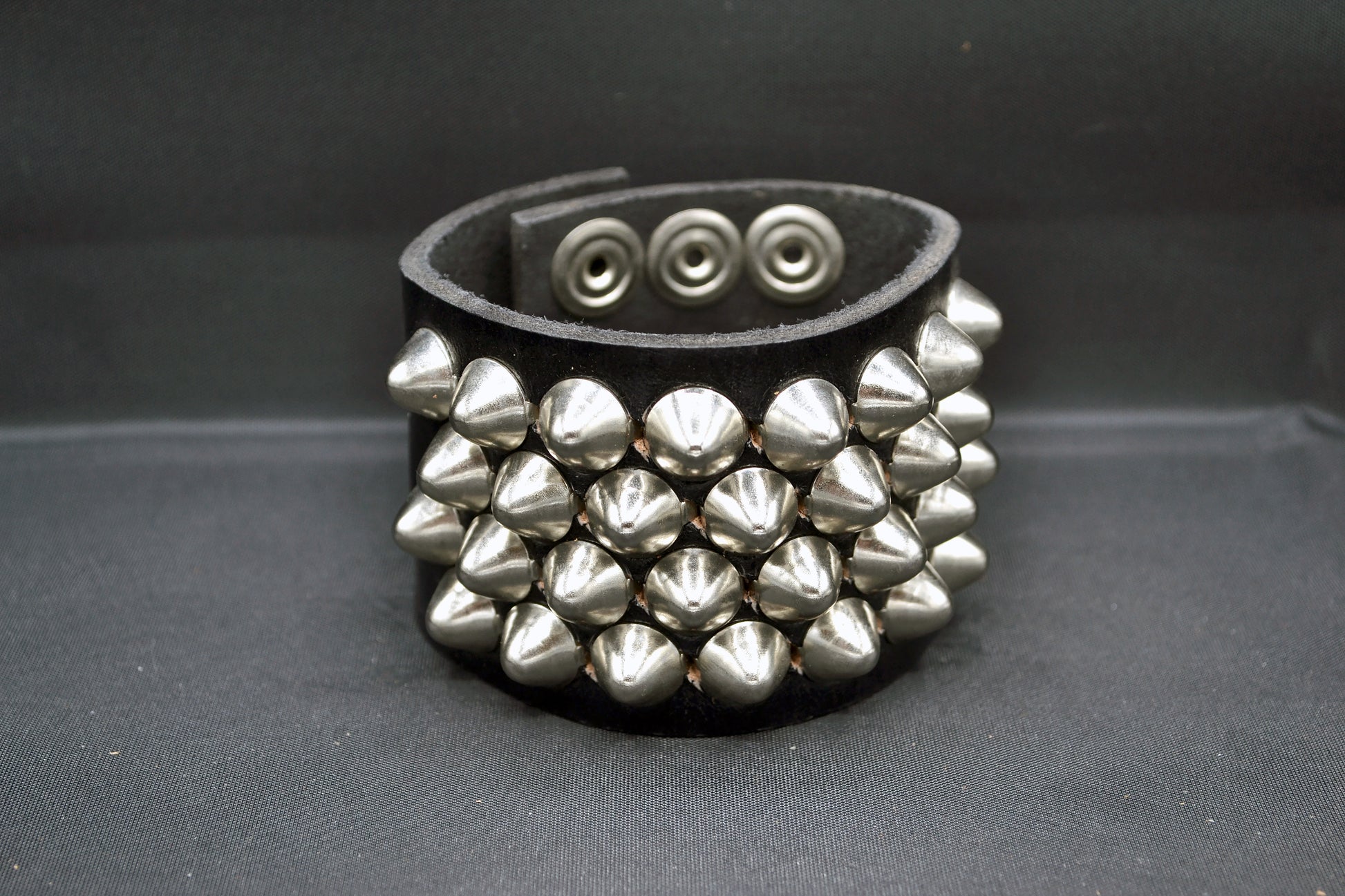 The bracelet is a delicate process to create and it takes attention to detail. These bracelets were made of the only available materials and tools at the time. The weight of the leather is 9 to 10 oz of a thick shoulder that was available in my confined workspace. Cumbersome as it may be it is as durable as the belts and with hard action snaps there is potential for heavy durability. Studs are set properly so they will not chafe the wrist. Bondage rings and studs are a classic look. The heavy bracelet is a landmark of the beginning of this business and made from necessity. It represents that mentality.