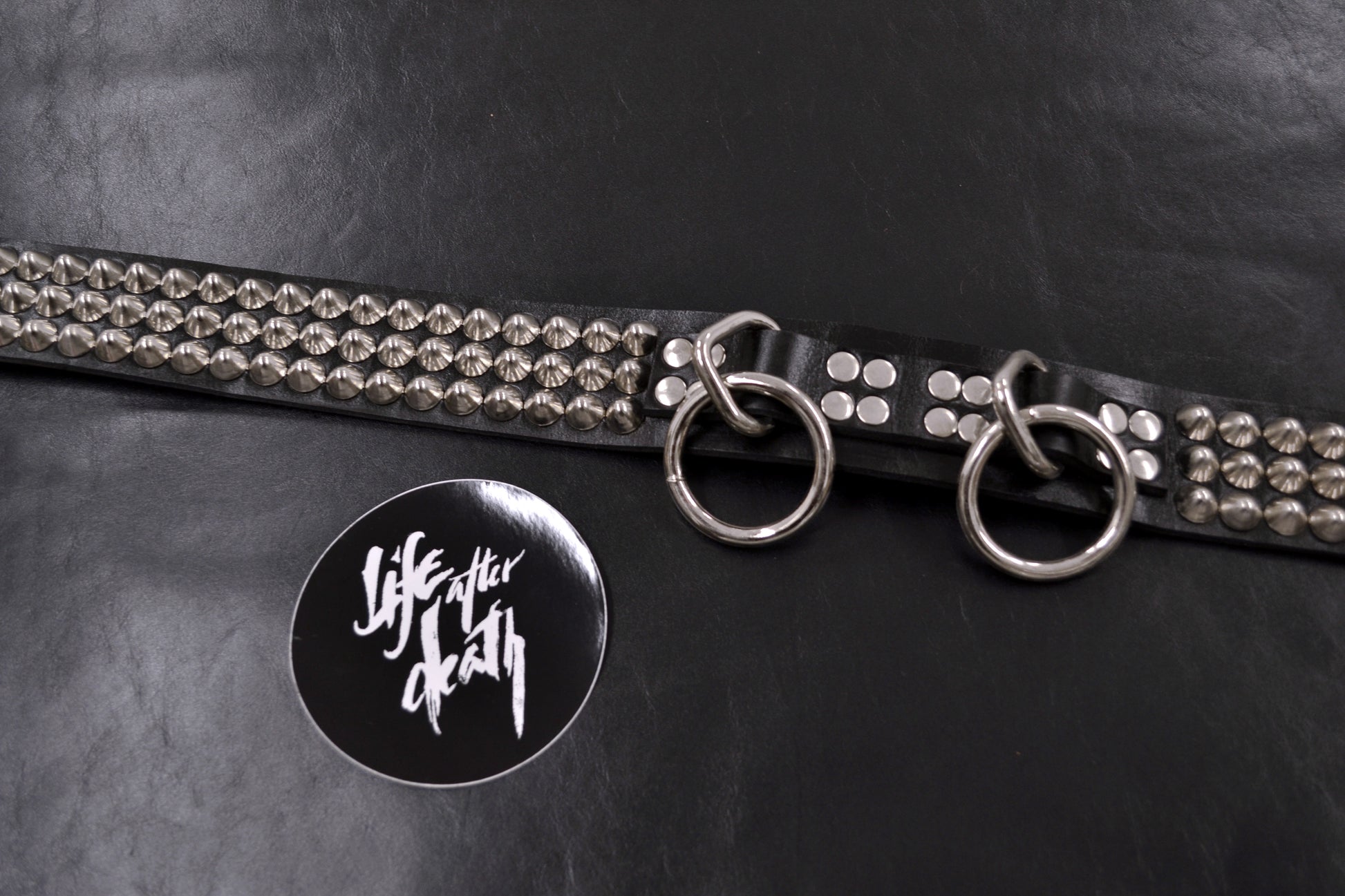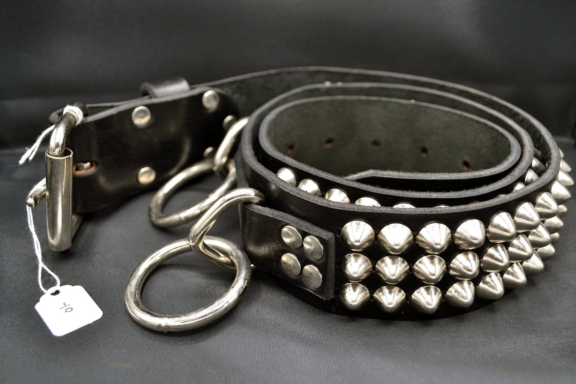 This type of shining black leather is a best combination explored by enthusiasts and respected by serious crowds. It features both the bondage ring and studs which represent a duality of power in the individual. For the bizarre or eclectic this unconventional design will make a statement or surprise some people by doubling the submissive feature.