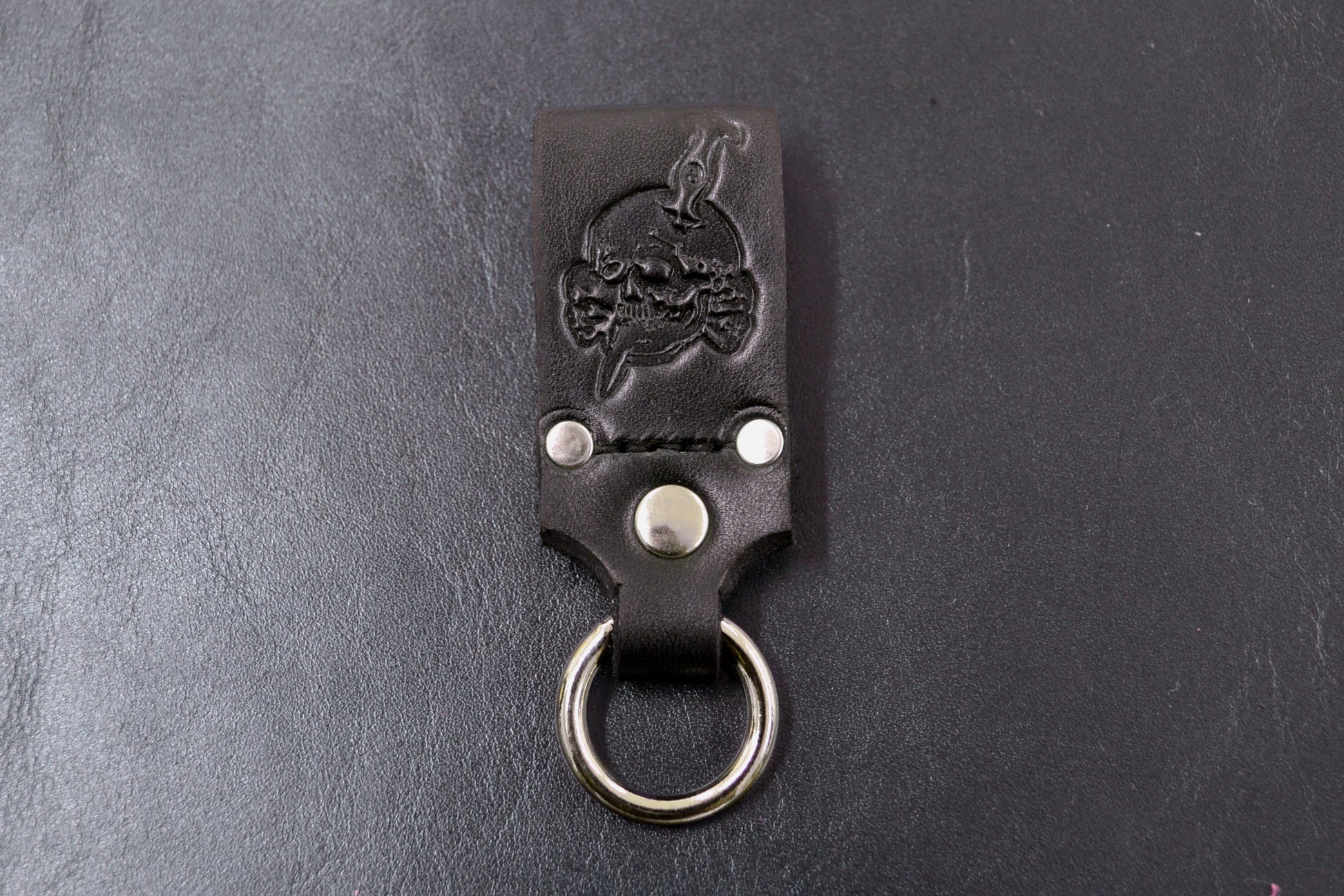 A simple key fob made to fit 1 1/4" belts perfectly, it slides on any fitting belt end equal to or less than the measure. Hook a wallet or key chain to this or wear it as a possible attachment to be used any time. This keyfob is made of 8 oz harness shoulder and will not break no matter what. Secured with rivets and sewn together it will endure hard action. Stamped with the deathshead leather logo, the SS skull with a dagger through the head. Finished with a seal the leather will resist rain and retain its form. Great for a hidden and subtle accessory and symbol. You may attract discerning people by wearing this.