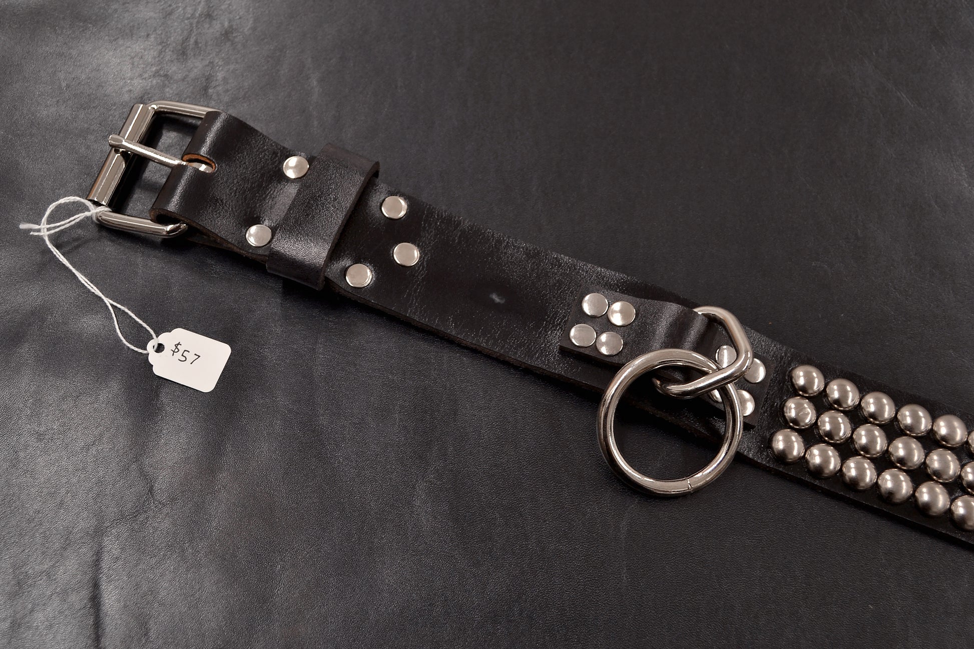 Using black drum dyed leather these strips are made with 8 to 10 oz cuts of bend leather which runs along the back of the cattle. This harness leather is flexible with a firmer tannage that shows wear much better than many other types. It is more true to leather texture than to fabric or synthetic. Roughly coated with finish these belts have a diy character that also shines evenly in light angles. Dome studs complement the hardware perfectly as a clean and ordered look that emphasizes the symmetry of these rows.The ends are worked up to the standard I have made for this series. All hand tooled there is no machine work done here so it can be considered the most organic and natural. Wear it wisely to maximize the respect and try your new position among the willing.