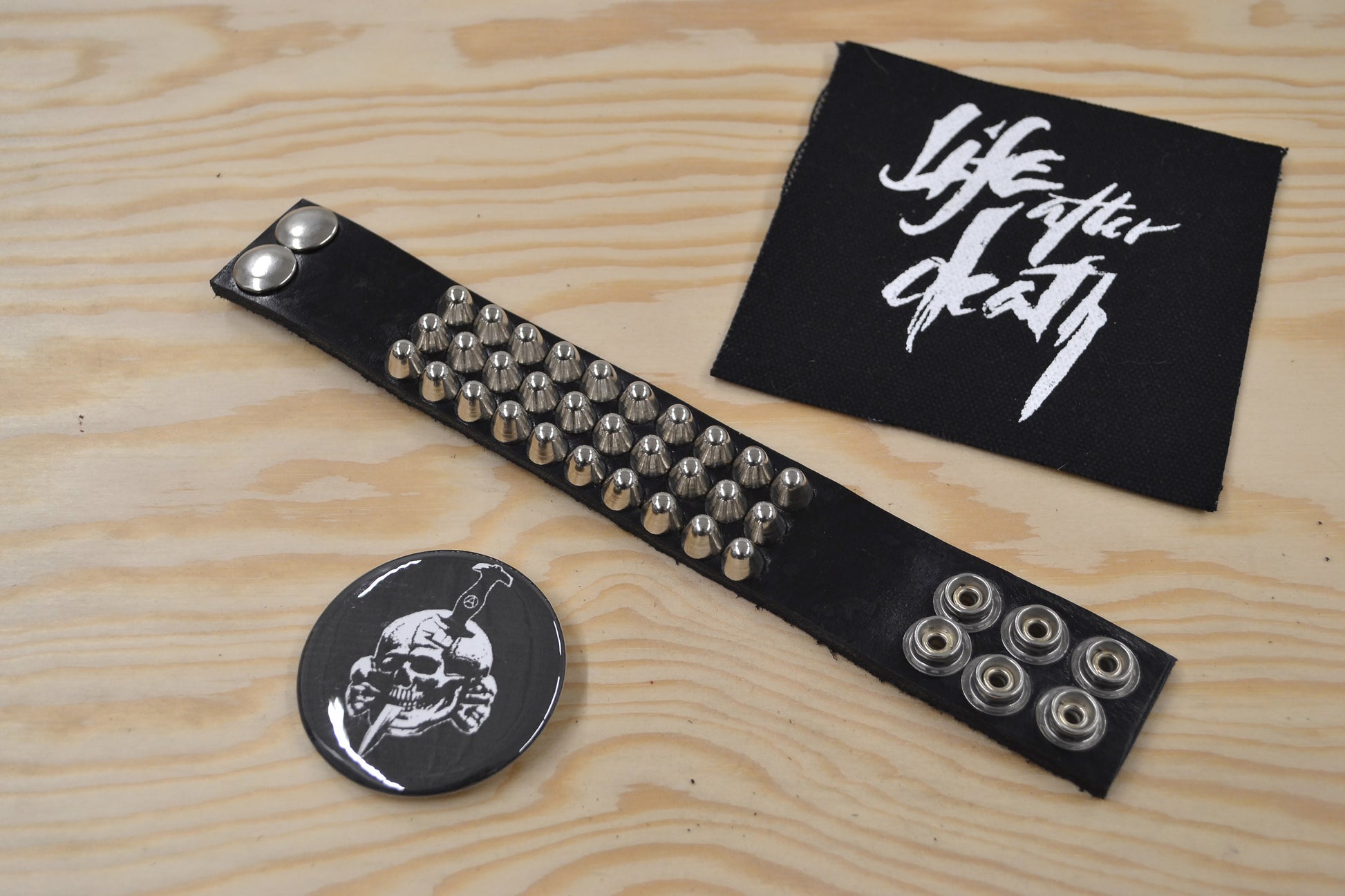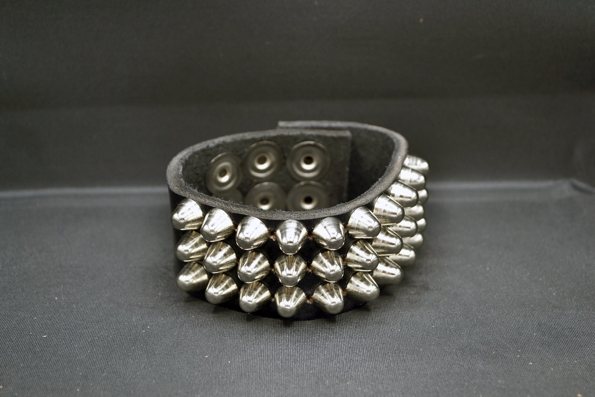 The bracelet is a delicate process to create and it takes attention to detail. These bracelets were made of the only available materials and tools at the time. The weight of the leather is 9 to 10 oz of a thick shoulder that was available in my confined workspace. Cumbersome as it may be it is as durable as the belts and with hard action snaps there is potential for heavy durability. Studs are set properly so they will not chafe the wrist. Bondage rings and studs are a classic look. The heavy bracelet is a landmark of the beginning of this business and made from necessity. It represents that mentality.