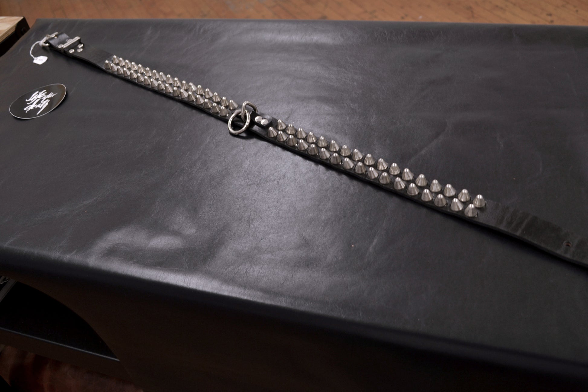 This heavier cone stud bondage belt is the predecessor of the others. It uses the heavy skirting leather that is fit for the most durable pieces. Harder for tooling at this level of detail, the thick leather just barely fits the shape of a standard belt. Even beyond standard. Its firmness and weight can be broken in quickly and considered durable from the beginning. Plated metal bonage rings and studs make up this understated and specialized design. This type is hard to tool and required much hand strength to manipulate the material. You can see its exceptional quality from the materials used.